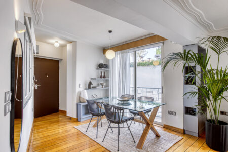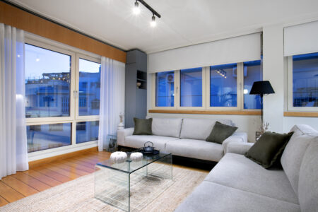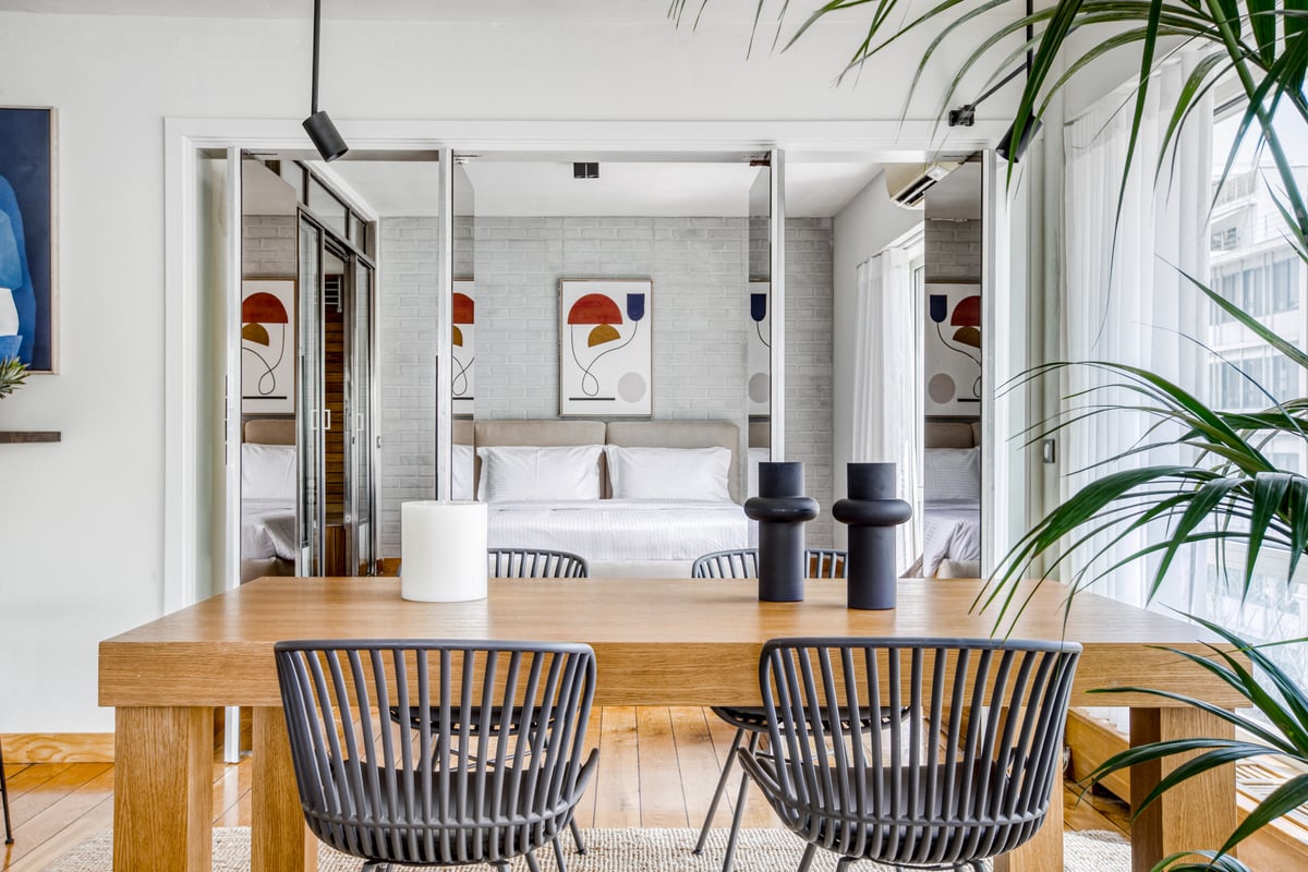 The apartment combines sleek, contemporary design with cozy touches